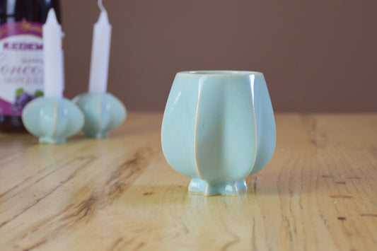 • Handmade ceramic shabbat kiddush cup titled 'Pom Kiddush Cup - Gold and Green' – modern Judaica by Feldi Studios
