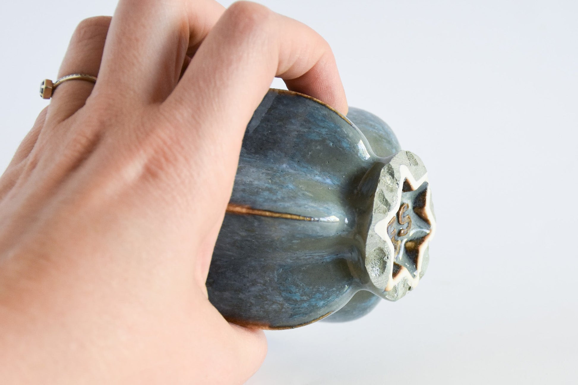 Elevate your Shabbat table with the Pom Kiddush Cup - a handmade ceramic wine cup inspired by the pomegranate, a symbol of abundance and mitzvot in Jewish tradition. With its grounded footed form and organic curves, this modern Judaica piece brings beauty and symbolism to your weekly ritual.