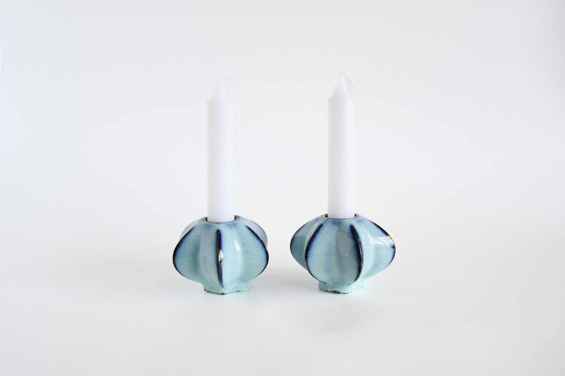 Add light, beauty, and intention to your Shabbat ritual with this handmade ceramic Shabbat candle holder set. Designed to complement the Pom and Stemmed Kiddush Cups, these holders are minimalist yet rich with symbolism - perfect for the modern Jewish home.