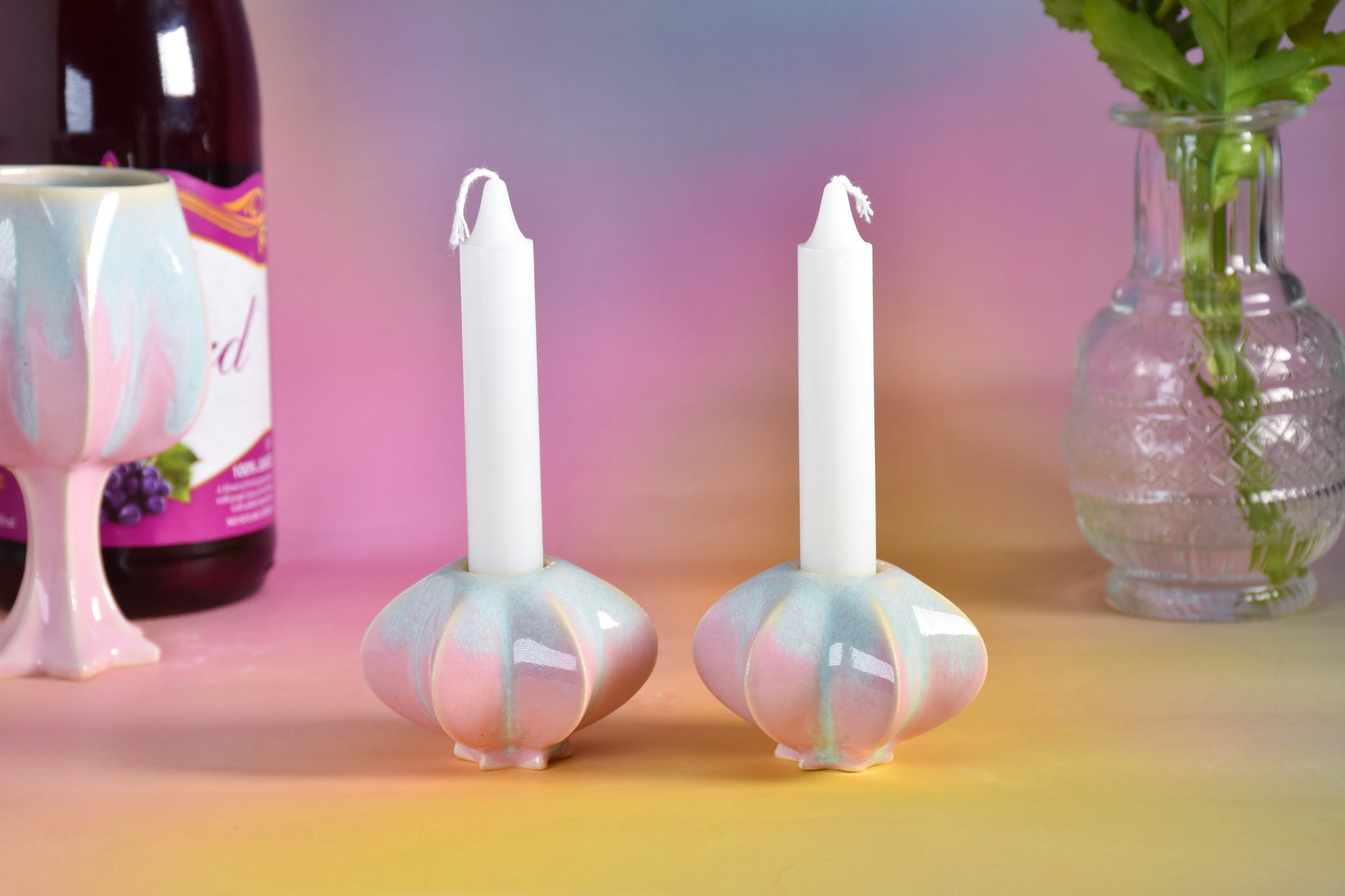Add light, beauty, and intention to your Shabbat ritual with this handmade ceramic Shabbat candle holder set. Designed to complement the Pom and Stemmed Kiddush Cups, these holders are minimalist yet rich with symbolism - perfect for the modern Jewish home.