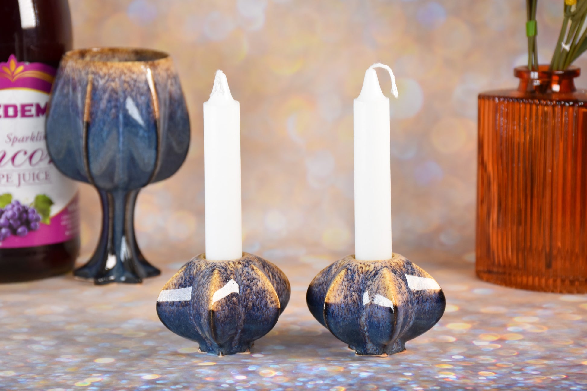 Add light, beauty, and intention to your Shabbat ritual with this handmade ceramic Shabbat candle holder set. Designed to complement the Pom and Stemmed Kiddush Cups, these holders are minimalist yet rich with symbolism - perfect for the modern Jewish home.
