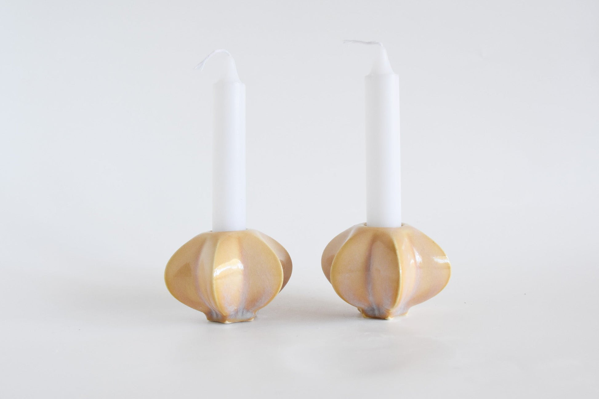 Add light, beauty, and intention to your Shabbat ritual with this handmade ceramic Shabbat candle holder set. Designed to complement the Pom and Stemmed Kiddush Cups, these holders are minimalist yet rich with symbolism - perfect for the modern Jewish home.